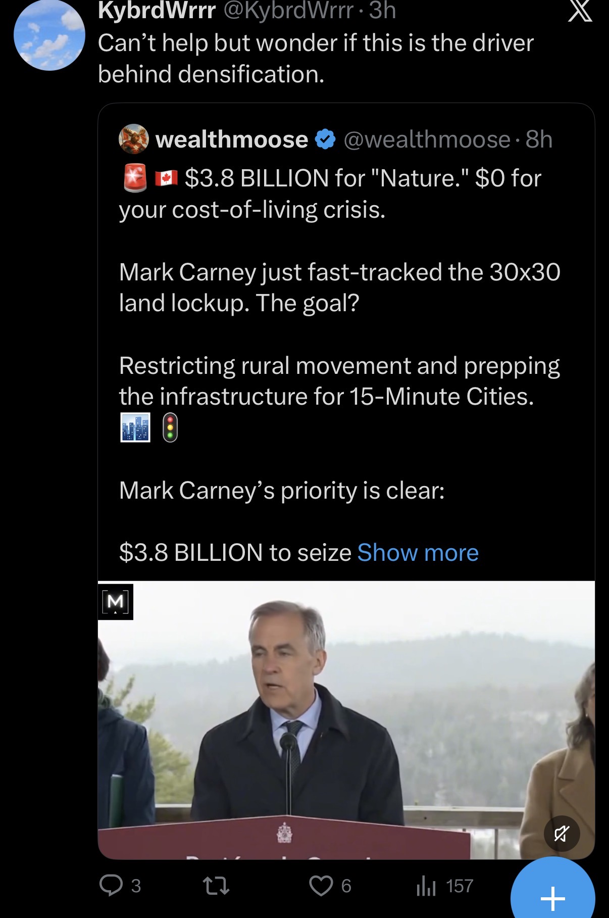 Ok boys, ready for some nightmare fuel.So the UN has this initiative right, they call it 30x30. It’s a globalist goal to “protect” 30% of the natural land of the world or some shit by 2030. Carney made this $3.8 Billy commitment today in regards to this. The purpose is to financialize natural resources so the elites can trade more dollary doos mainstream themselves. The thing is, the government only owns like 6% of the land in Canada so they’re basically planning to steal it from you. You aren’t going to need those hunting rifles when there’s no privately owned or crown land for your to shoot on. Probably not too surprising to you, you all know this fucker was parachutes in here to look after the interest of transnational capital. They’ve been testing this financialization of nature for a while as well, cordoning off regions of forest in South America, considering it “sequestered carbon” and then selling it as a carbon credit debt instrument. Basically you are going to have to love these people really hard because they’re not going to stop until you’re all either castrated city normies or dead. I love these mother fuckers so much don’t you. https://x.com/mbrant75/status/1909214225559363779?s=46Each day that goes by and I think more and more mom was right and this is the end times afterall shiiieet.