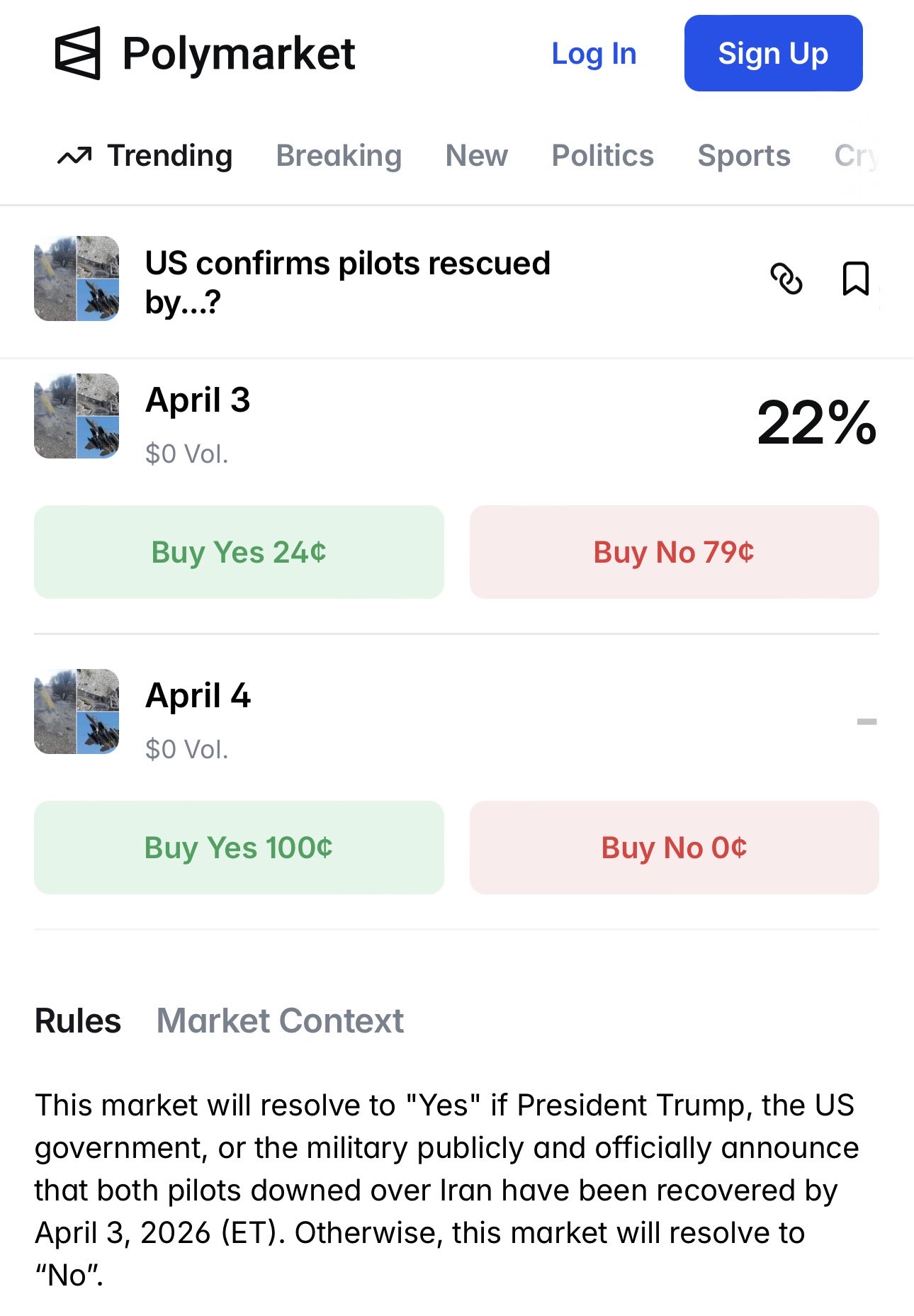 Imagine being a downed pilot scrabling through the mountains of Iran, and the president's idiot son is making money by inducing morons to gamble on whether you live or die. Crazy dystopia levels.
