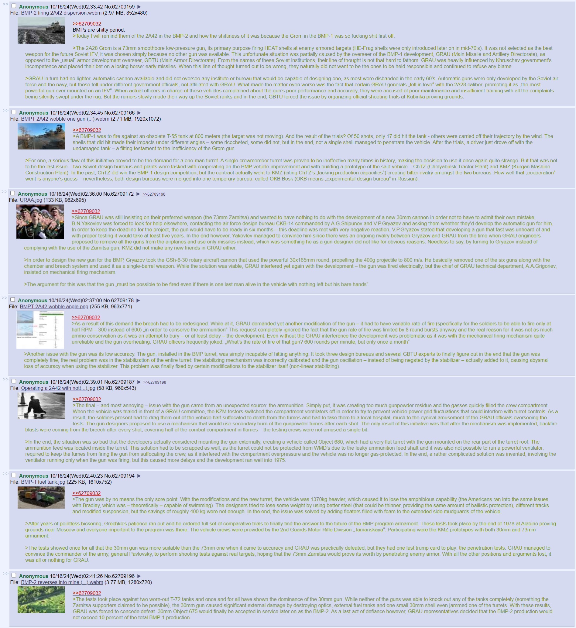 >>65048688>What is more likely to kill an enemy tank, 73mm HEAT projectile or 12.7mm steel core bullet?according to the soviet tests, neither.>GRAU in turn had no lighter, automatic cannon available and did not oversee any institute or bureau that would be capable of designing one, as most were disbanded in the early 60’s. Automatic guns were only developed by the Soviet air force and the navy, but those fell under different government officials, not affiliated with GRAU. What made the matter even worse was the fact that certain GRAU generals „fell in love“ with the 2A28 caliber, promoting it as „the most powerful gun ever mounted on an IFV“. When actual officers in charge of these vehicles complained about the gun’s poor performance and accuracy, they were accused of poor maintenance and insufficient training with all the complaints being silently swept under the rug. But the rumors slowly made their way up the Soviet ranks and in the end, GBTU forced the issue by organizing official shooting trials at Kubinka proving grounds.>A BMP-1 was to fire against an obsolete T-55 tank at 800 meters (the target was not moving). And the result of the trials? Of 50 shots, only 17 did hit the tank - others were carried off their trajectory by the wind. The shells that did hit made their impacts under different angles – some ricocheted, some did not, but in the end, not a single shell managed to penetrate the vehicle. After the trials, a driver just drove off with the undamaged tank – a fitting testament to the inefficiency of the Grom gun.