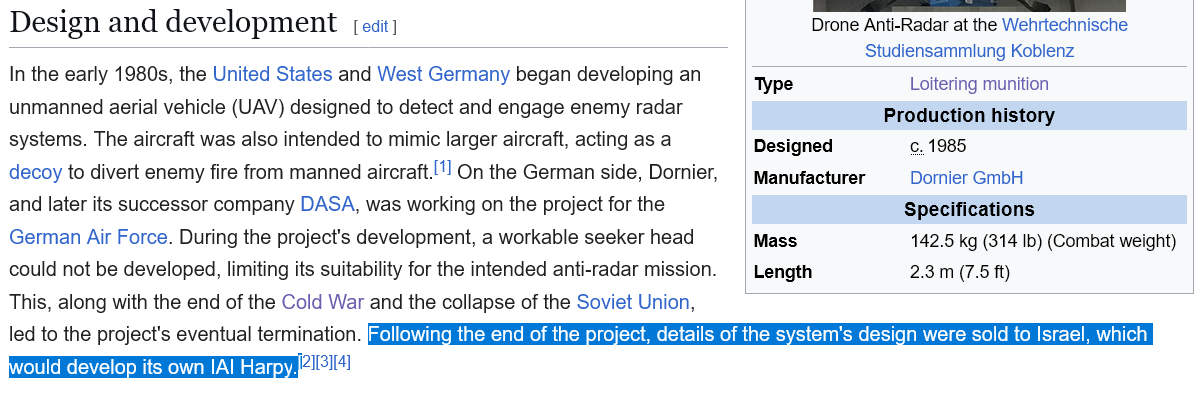 >>65058253>>65057995>Speculation that the findings about the DAR influenced the design of the IAI Harpy, or that the DAR later served as a model for the Iranian Shahed-136/131 drone or its Russian version, Geran 2 , cannot be substantiated.Ripped straight from the wiki