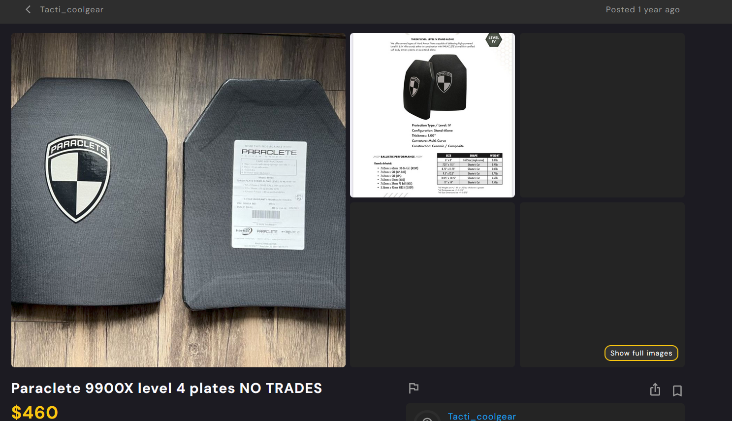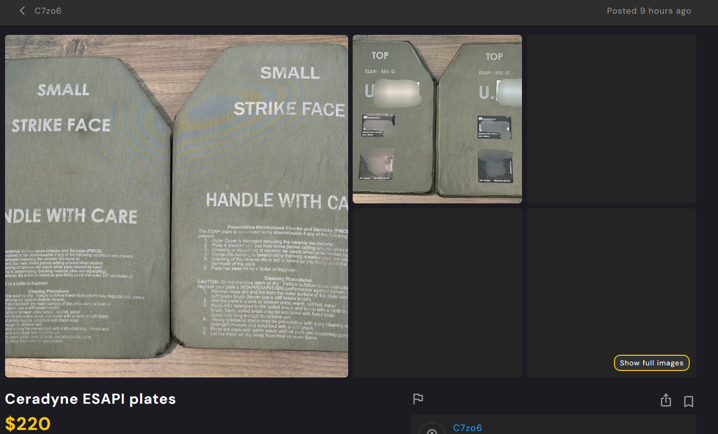 Interesting deal alert. Set of VelSys "B-VEL" coated steel covert plates on ebay for $700. These are an improvement on the PSTES first-gen steel plates but are generally inferior to the later PBZSA covert and boron carbide BZ API Secret Service type members of the VelSys ULV family. Also four times the weight of the 7.62x39 MSC only VS-PXULV all-PE model.They pick up M80 / M855 / M193 (watch velocity) protection over just 7.62x39 MSC as with PSTES / PULV. 6lb a plate. Steel, so in spite of the coating they will spall.https://www.ebay.com/itm/267617435158IMO, these are horrible generalists but serve a niche for low profile rifle protection. I'd prefer the all-PE PXULV unless M855 is a problem, since the PXULV is 1.5lb, not 6lb, and in theory passes through a metal detector because it has no metal. If threats are stiff (M855A1 / BZ API) the rare covert-cut PBZSA variant is better. Secret Service version is even better but street price is $5k a set and it only came up for sale one time, so it's like the Ceradyne SAECs. Uber expensive top-tier totally "surplus" armor.