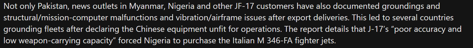 >>65065212>We don't know what, if anything. Since everything China does is always carefully curated and no one is ever allowed to actually verify things for themselves.Its an off the shelf export bird that has been bought by several thirdie countries already free for any Western intel to snoop into. Nobody has any opinions towards it as what you see is what you get: a 4th gen warplane.