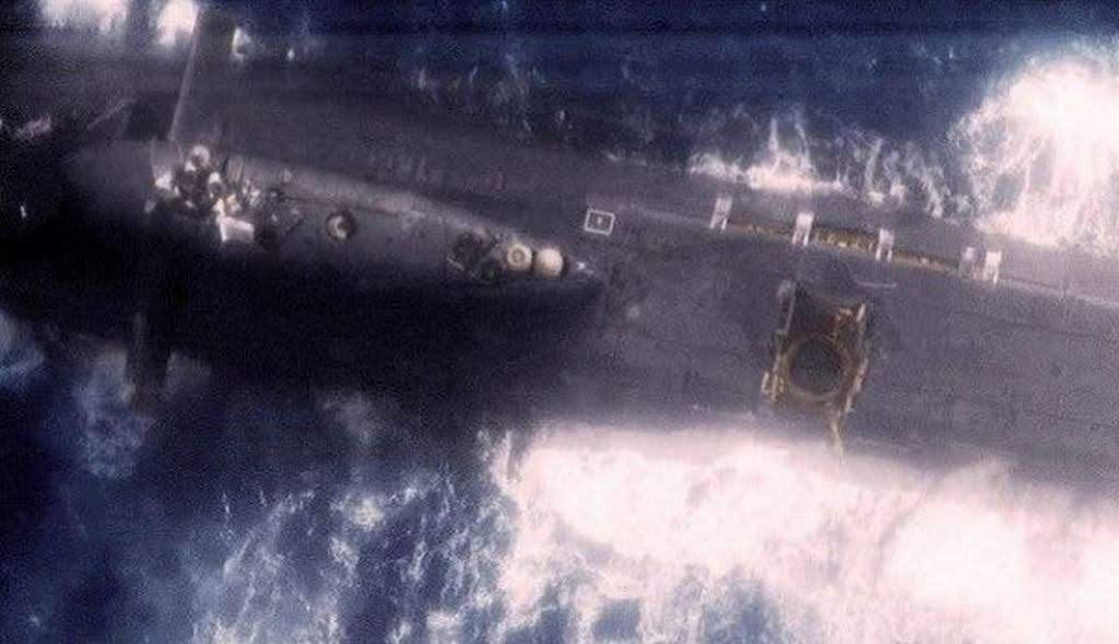 > flew up to a height of two kilometers and crashed back onto the reactor, then fell onto the side of the submarine, rupturing the hull below the waterline.