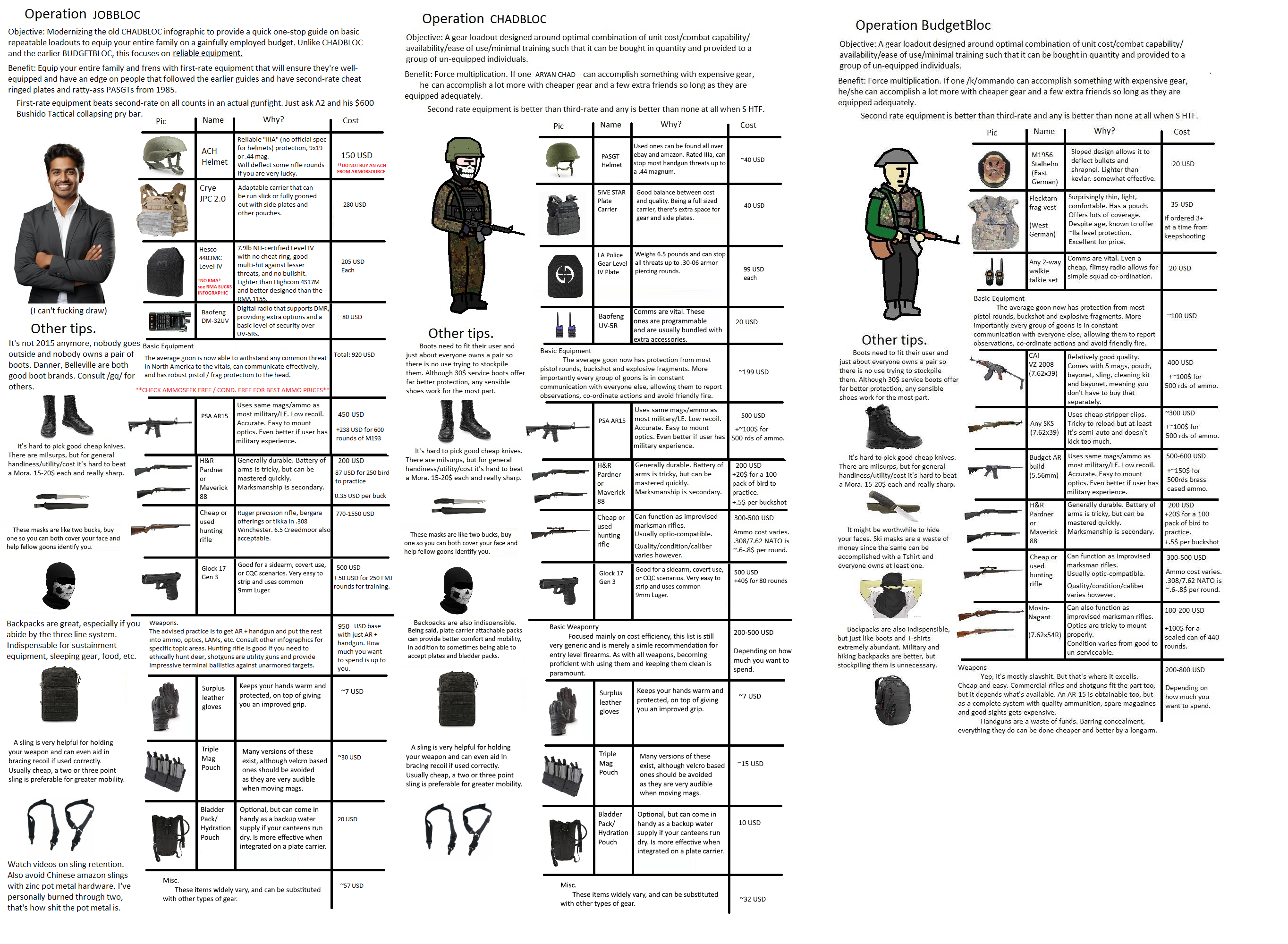 >>65083709Good shit, in exchange here is the combined version of all three "BLOC" old school infographics.Basically the purpose of these was to provide an entry level "just gimme shit that works I don't care about fucking Hescum 4403 vs Highcum 4SEX4 vs Gilliam Technical Arms Rouge Crouissant 9969" or "JPC 1.0 vs 2.0 vs 3.0" nuance.