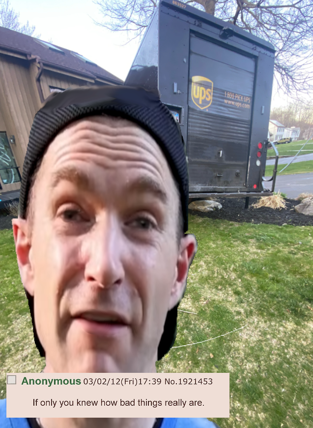 >>65083689Did this once, UPS guy literally drove by amd didnt even stop and try, I was screaming at him like a lunatic as he drove off.