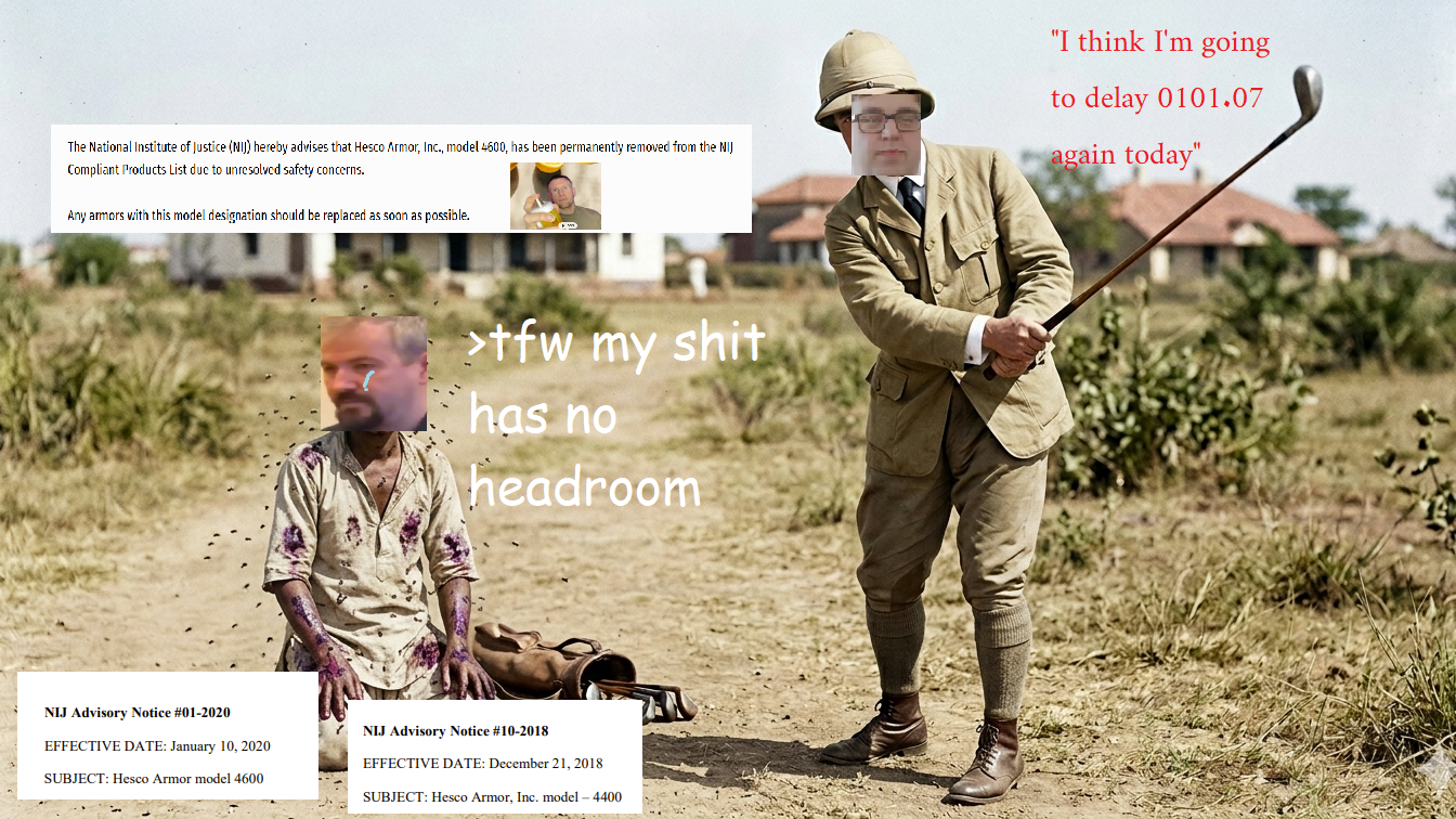 >>65084917If it's lo-vis and NIJ compliant then it's going to have to be steel. I'm sorry.>>65084927>>65084892>Could have published NIJ 0101.07 if I hadn't had a zoom call with Safariland!>Don't fuck with this Director!>The Chinese certified plates will be purged from the CPL and the Americans will thrive — free to be purchased with DOJ BVP grants as they see fit. They’ll make Armor great again!>Drop foam, son. It compresses in response to physical trauma!>Making the mother of all CPLs here, Hesco, Can't fret over every suspension!