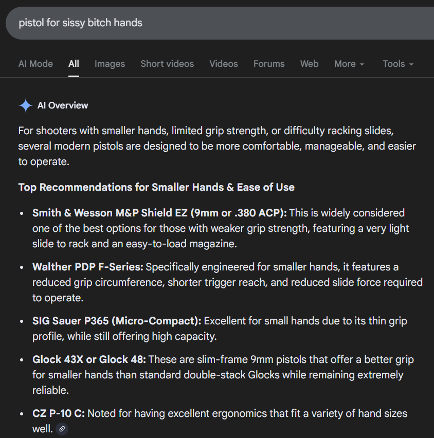 >>65086123The bodyguard 2.0 makes 380 feel like .22 and shoots way better than a gun that size should. It’s the perfect pocket gun and if SW made an all metal frame one I’d even pay $1000 for it. Too bad Hollywood is compromised by gynocentric agendas otherwise it would become the next “PPK”