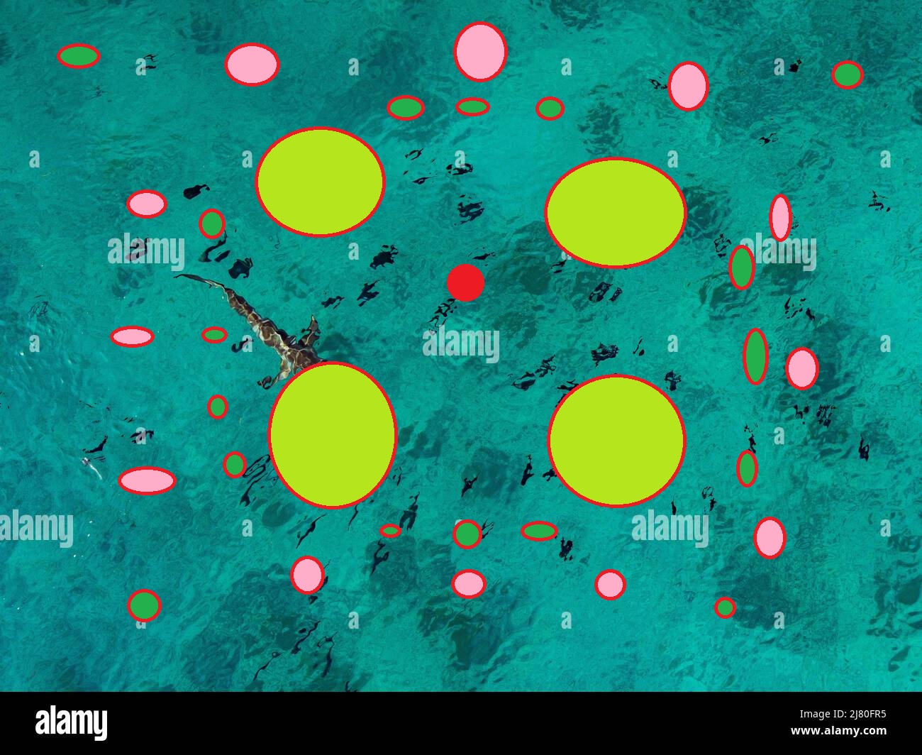 If I'm diving on the red dot, the big circles are the preparation explosives, the concussion blasts. Then the circular ones in pink there are the smaller grenade size shrapnel bombs for the ones that run from the boom but circle back mad. THEN the green ones are baited underwater mines with two outs on the cardinal corners.After that an LMG on the dive boat can't hurt I guess, as long as the anti shark torpedoes are prepped and tubed to go.