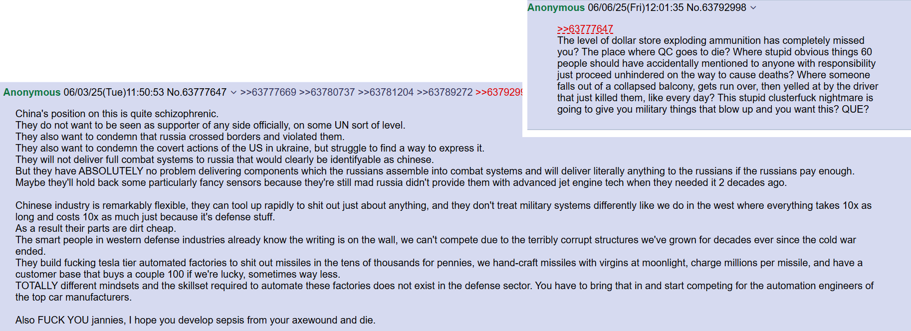 >>65088063Man, Xi's newest round of purges have made Chinese shills so much more entertaining. You never got this retarded blend of Chinese historical technological revisionism and korean war sacrifice larp under Hu. Say what you will about that grey boring bastard, but he at least knew to never export this shit abroad and at least kept the narratives separate.Assuming you're not a buck broken disaporoid doing this for free, mind telling me how many news bosses you've had in the last two years? Because I know between the October plenum and this rolling military purge, that you've probably seen the scripts change. Also how much do you have to post Tang dynasty wank? Has Xi's Tang autismo been contained by those big budget cartoons coming out recently, or do you have some quota you have to meet?