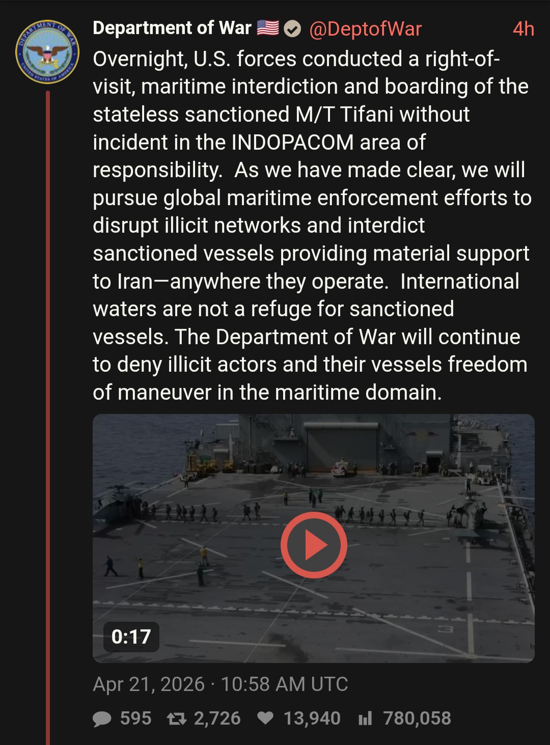 >>65090665Literally how does any of that logic apply? They hit the engine room with the 5", there was nothing done to eliminate a field of fire issue for the DZ before the marines landed. These ships are massive and don't make sudden moves. If a helicopter can land on a moving carrier or destroyer, it can land on a cargo ship. Let's also not forget the precedent of the US already doing this to shadow fleet tankers during the Venezuela conflict without firing a shot. This was a show of force. Tactically speaking there was no need to disable the ships engines.
