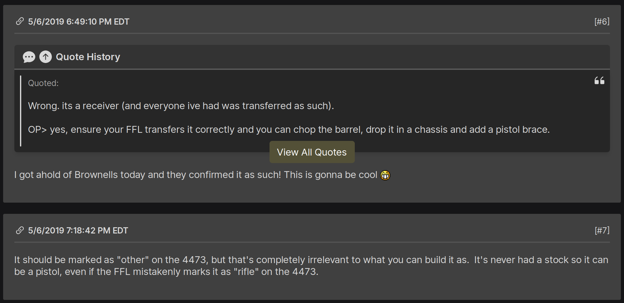 I actually know about this exact thing because I briefly worked CS for LSI which is Howa's US importer.>>65091461The Howa 1500 barreled actions are manufactured, exported, imported and sold as "rifles", so the workaround of doing a pistol build doesn't work. Howa is very specific about this. You have to SBR it if you are going to cut below 16".Also it's VERY IMPORTANT that you understand you are avoiding the warranty the instant you do this. The accuracy guarantee and any other service you might need goes out the window instantly.That's fine because it is your gun, but I recommend shooting it without modifications first to ensure that everything functions and that it delivers the promised accuracy. That way you can send it in for warranty inspection if anything is wrong. If everything is fine, you know that you are starting your project with a good rifle.Not that there are a lot of defective Howa 1500s, you should just assemble shoot and check just in case before doing any modifications.>>65091589You can't turn a rifle into a pistol. The barreled action is considered a rifle, despite not having a stock.This is a question we actually got a lot and yes we did have people send in rifles claiming "shit sux I can't get muh 1moa" only for a home bubba job to show up with an 8" barrel cut with a hand saw. Yeah no shit it doesn't group 1" you cut the barrel unevenly and didn't recrown shit. The company has since relocated to California where they can't have any NFA items on site, so if that type of shit shows up it has to immediately get sent back.
