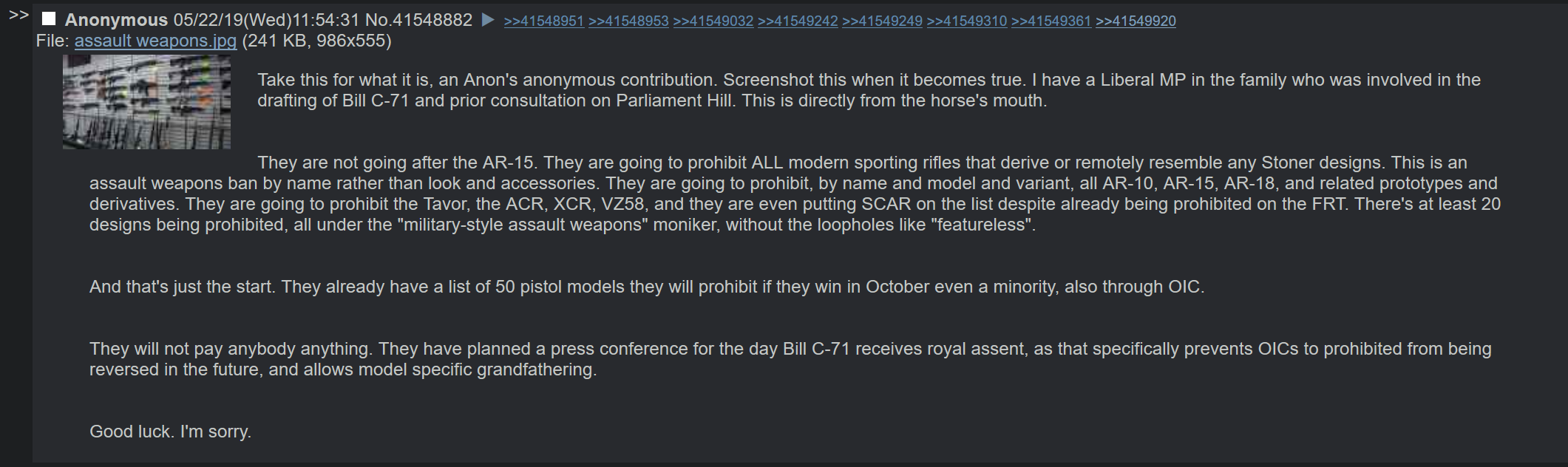>>65093972>>65093968>>65093991>>65094045My issue with the “Feds want the SCC to win” cope is that if such was the case they would have extended the amnesty. Instead Tamil Tiger Gary said on the press conference after the declaration period that it didn’t matter the SCC will hear the case as it’ll be anywhere to a few months to years long. He almost laughed it off when pressed about it.