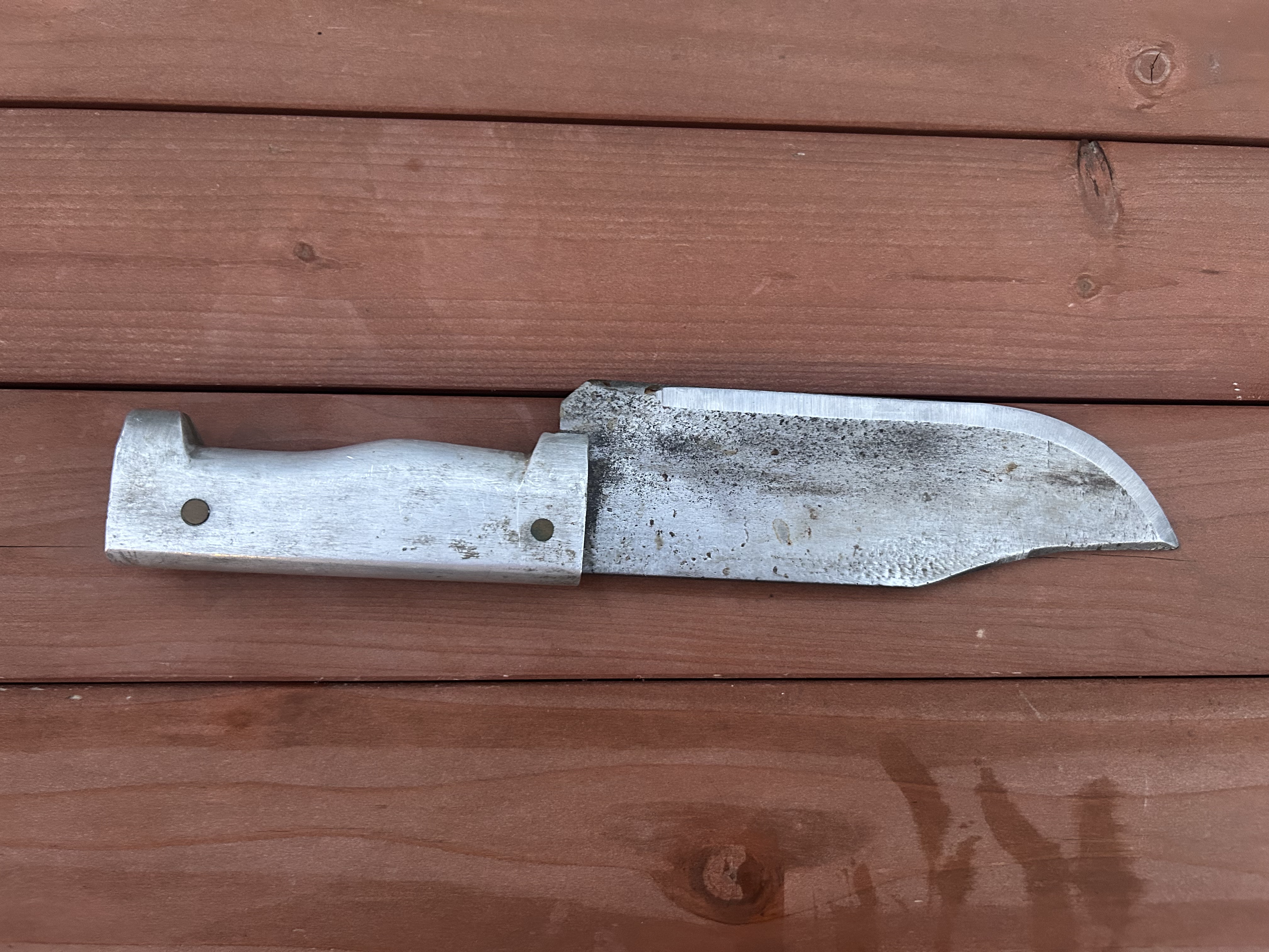 >>65104241>They thought it was an old slaughter house knife due to the solid aluminum handle.It doesn't look like any sort of usual butcher's or slaughterhouse knife, at least not in its current form. It's possible that it was something like that and was later modified.>>65104332>Could it have been a meat cleaver or machete someone had reprofiled?That's very possible. I think it has been modified from its original form. If it was an old 'working knife' then I'd expect an bunch of dings and dents in the butt end of the handle, yet it looks squared off with relatively clean edges. I can't imagine a knife that was used in an actual slaughterhouse not showing signs of being banged around, dropped, etc....unless that damage was sanded off while someone was modifying it. Now if it were originally a machete that would make more sense, as that wouldn't be used around hard objects where the handle would get dinged up.I don't think it's any sort of improvised trench knife. I've seen loads of those and they are usually more of a dagger or stiletto type of design, not a really wide design like that.