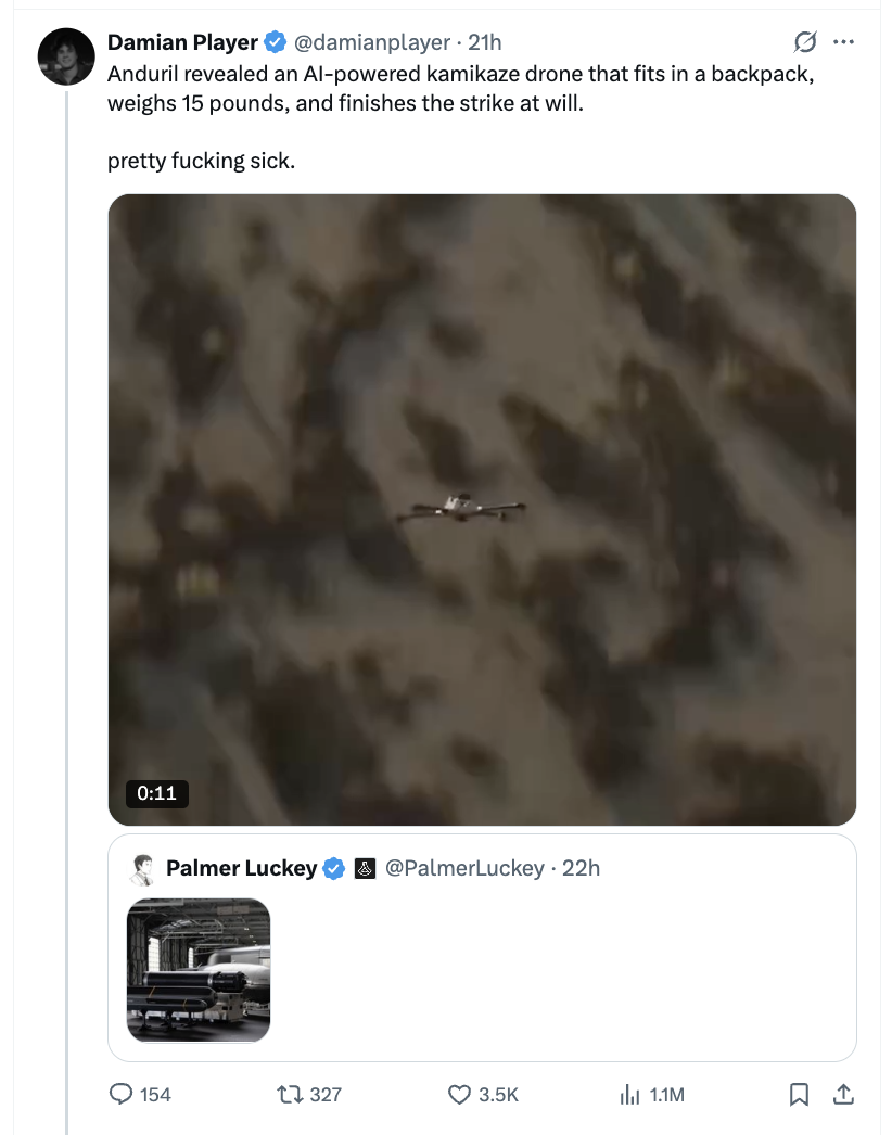 What's the actual state of the art as far as drones for warfare? Pic related was posted today>"Anduril revealed an AI-powered kamikaze drone that fits in a backpack, weighs 15 pounds, and finishes the strike at will.">"pretty fucking sick."