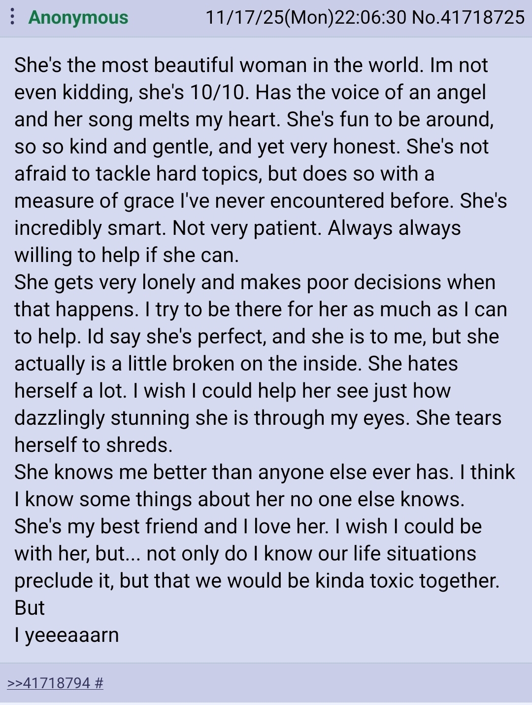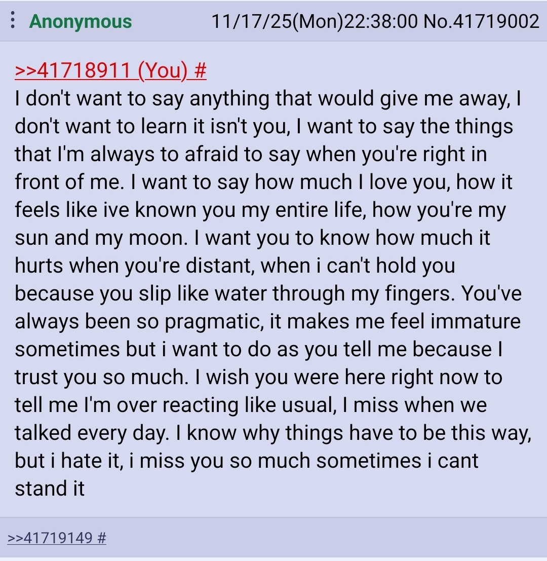 >>41889889That was something a very familiar anon wrote about me. Attached is the post I wrote that led to that (tho there were a few posts in between)