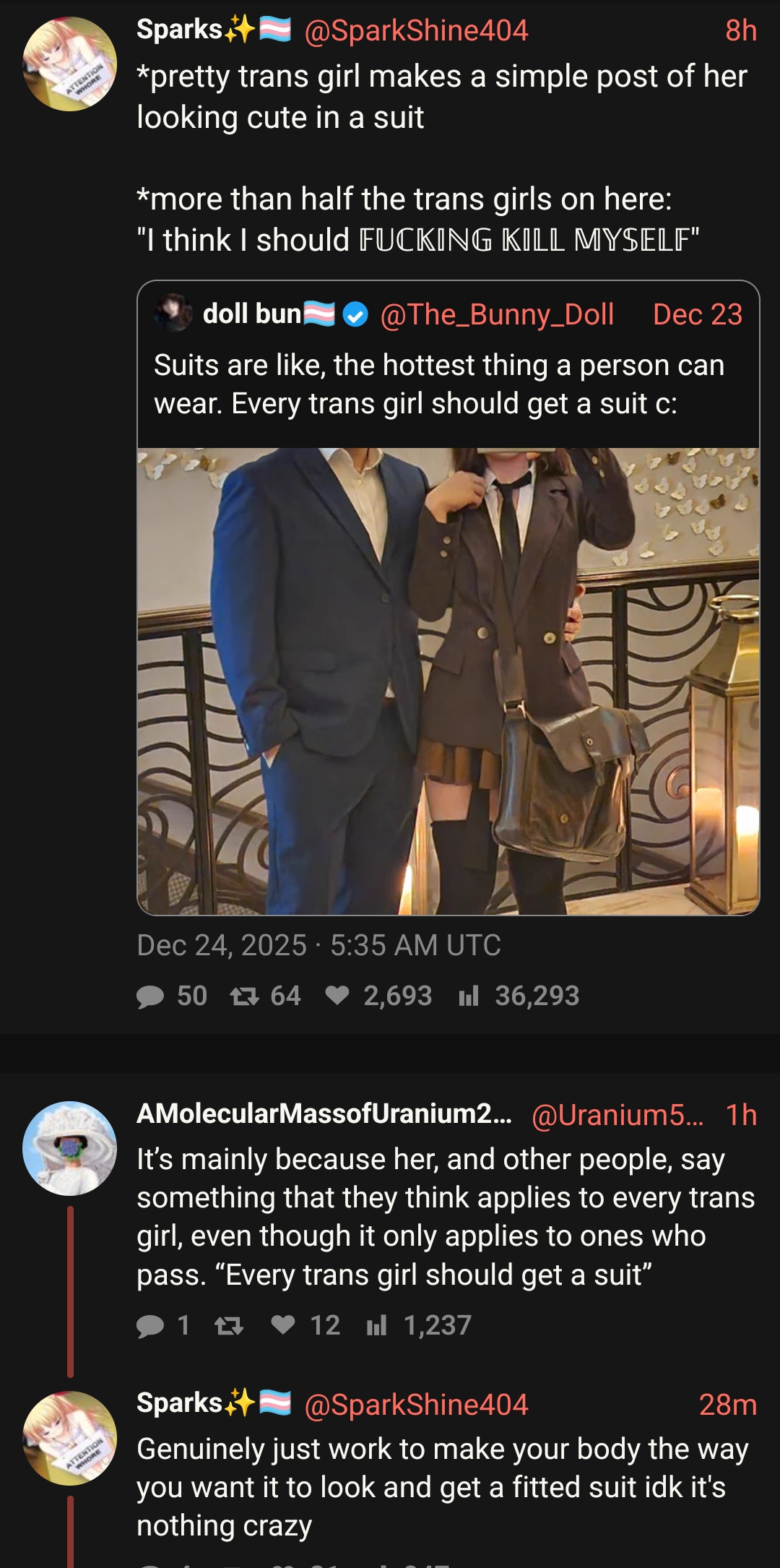 >>42109964>grow a spineStory of my life. I constantly let people abuse me. My partner, my family, my work(thankfully im in a good place now with work) its just hard. Idk why im like this. But yeah, passing is nice. If I didn't even pass on top of everything else I'd lose it.