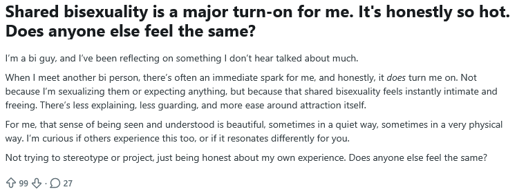 Homura editionPrevious: >>41924395>QotTWho's your waifu/husbando?Tagmap: https://tagmap.io/tag/%2Fbigen%2FFAQ:>Am I bi if I like women and femboys/traps?>Am I bi if there's this one member of the same-sex I'm desiring, but normally I like the opposite sex?>Am I bi if I sexually like both sexes, but only interested in romance with one of them?Yes, sexual attraction to both sexes is bisexuality.>Do you have presents ready for me Santa?Comment too long. Click here to view the full text.