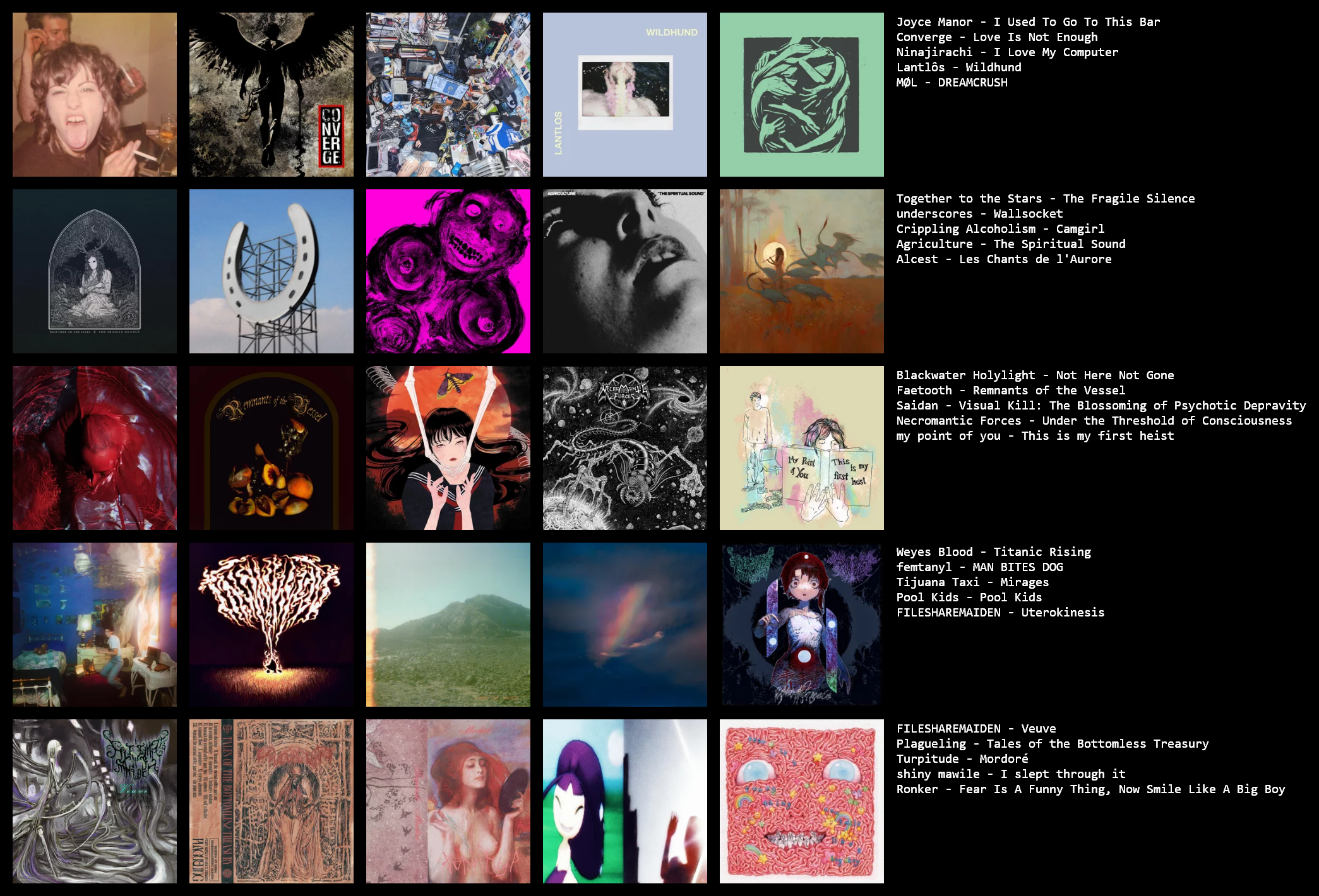 recent stuff>>42892757+hey, ily+pup+jeff rosenstock+nin>>42892840+bjork+sweet trip+nujabes>>42895708gonna listen to this rn>>42895779+jane remover+bladeeComment too long. Click here to view the full text.