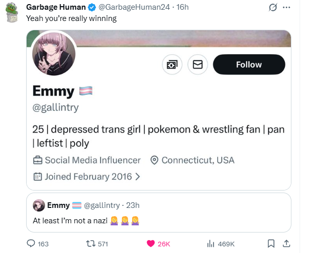 >>42047435Glad to hear it!>>42047457>>42047467Yeaaaaaaaaah the 20-somethings can get like this in real life too. Part of what ran me out of a trans support group. Truly the sissy vs arrested development duality of tran.