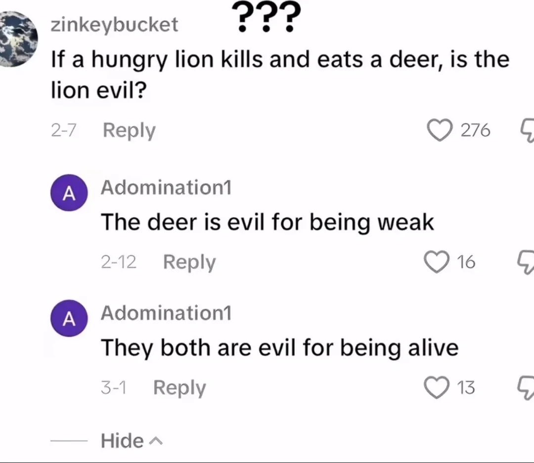 >>42010143black and white world views. Lalaland of stereotypes. Limited empathy cause they have never really suffered. Any sane person knows they have no right to control anyone's bodies/lifes choices cause they would be an oppressor, which are only ones deserving of that. They would be getting taste of their own medicine. They should be teached actual critical thinking in school. You can't often make them accept truth when they older except empathy training. WE DO NOT OWE ANYONE ANYTHING