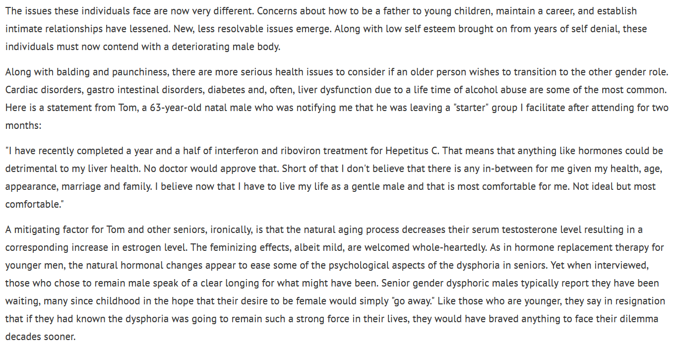 >>42302779I spent some time going down every possible rabbithole, and even considered taking a high dose of LSD without taking any psychedelics prior because someone told me it could cure my troon thoughts. But, ultimately, I trooned out. Why? The original John 50 study & the beginning of male pattern baldness were the two biggest factors. Reading about men who had spent an entire lifetime living "godly" lives, only to have the same intense dysphoria at 65 that they had at 25, is literally nightmare fuel. Keep taking your HRT, or don't, but I guarantee you with God as my witness that you will always be a tranny in your core
