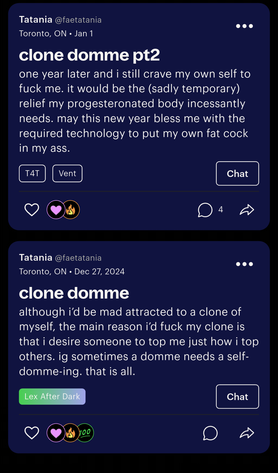 I'm poon but I want to buy hyperfem clothes for a qt gf and fuck her in them. Among many other kinks, like dressing her up like a puppy girl and cuffing her to the bed and "knotting" her, and writing horny shit all over her body and blindfolding her and larping as if she's getting ran through by a whole football team with a bunch of different prosthetics. But then every time I actually have a gf my extra degenerate fantasies go away and I'm just happy to have perfectly vanilla loving sex in the missionary position so idk. Also I'd be too ashamed to bring this shit up with a girl, I could probably only do really depraved stuff with another dude that would understand terminal horny brain.