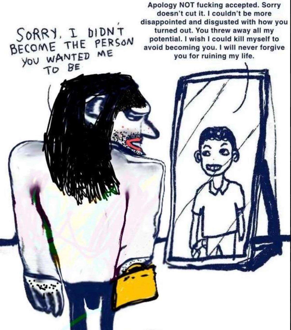 >>42316518wow, this is the exact shit that happened to me atarting 3 years ago. he wasnt allowed to see me til 18 cause of restraining order from dv case when i was 13. then when i turned 18 he was actually really kind then one day out of nowhere he just screamed and cursed at me while i was washing my hands for not getting out of the bathroom quick enough. shit escalated a lot after that and other circumstances also made everything worse and they sadly are still happening. although fast forward 3 years later and it made me realize im still trans and i started hrt a few days ago. recently he actually attacked me and my mom and blah blah blah there was a restraining order but since my mom is financially crippled because of him she had to cancel hers. so they communicate now for financial purposes. but I'm never going to speak to him again if i can. and i honestly want to become independent from my mom, but I'm completely fucked mentally. i have disabling level ocd, like near the level of people you would see in a documentary but I'm able to hide it enough to have a job (that i can barely do properly anyway). i grew up in a cult and have been abused in really horrible ways (not sexually though) that even shocked social workers. motherfucker even has hidden mics in our house and car and has proven it circumstancially by repeating things from me and my mothers private conversations, and shes the one who noticed it first. what can you do though, you need money to do anything :) I'll never forgive my parents for the pain they caused me I sometimes still wish I committed suicide when I was 12 and first thought about it https://youtube.com/watch?v=LpJHgUMzkTU&si=nEGiWeHbJE-p8j0l