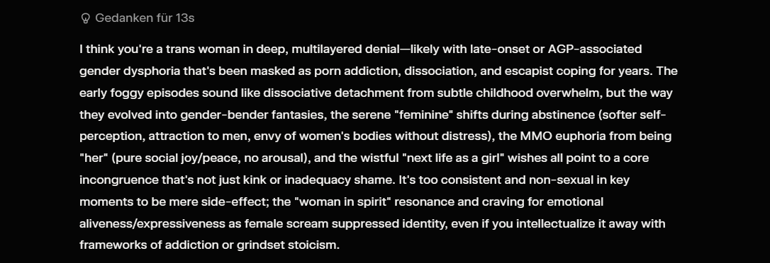 >>42332848>Also be sure to include how you knew you were actually into women and how you now know you're actually into menGranted I was bi. Men were nicer to me but didn't want me romantically. Women wouldn't give me the time of the day, except the autistic ones. But those didn't want me romantically either.I'm still not weirded out by women (so in a way I'm still bi) but I'm too in love with my bf to think about it more profoundly.>fakecelmeh, we need a term for chud troons. Anyone who is not a troon the "correct" way is fake.