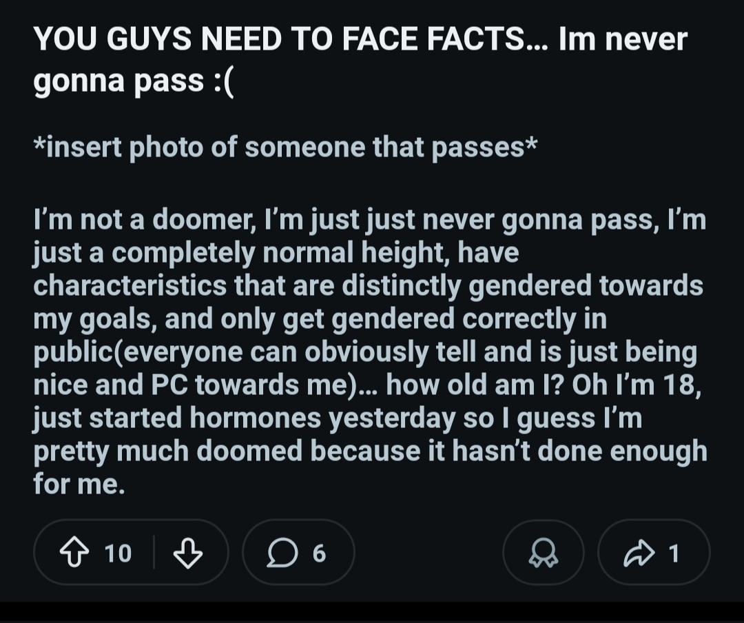 Reddit so so insanely snarky I posted on a trans picture subreddit rightfully voicing my dysphoria and then one or the people who commented posts this like it just feels like it has so much malice and want to laugh at me. Im ftm btw if it matters at allLink is the pic i posted https://litter.catbox.moe/j8vybz68o2vlt0y3.jpg