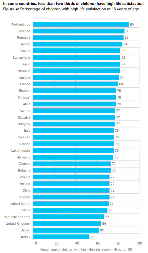Children and young people have higher life satisfaction in places significantly poorer than the US. Like Hungary never had a proper middle class (and still doesn't), yet somehow produces happier young people.