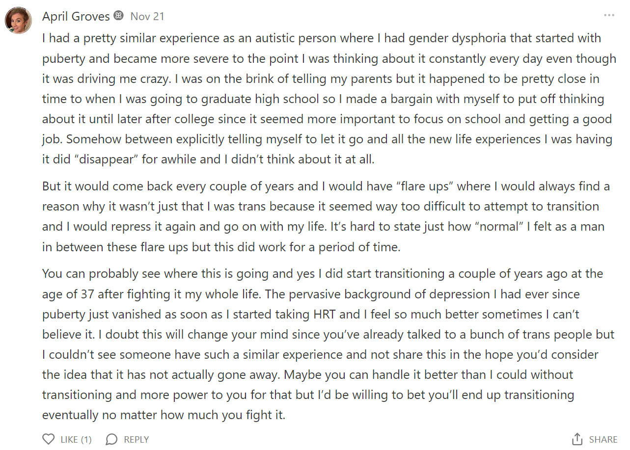 >>42396834Because I'm going to develop ROGD from being on and off T