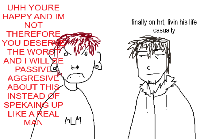 >start hrt>pre-t ftm ex-friend finds out and suddenly wants to meet you after 4 years>meet him>wtf is his hefab bf doing here>not even 5 minutes have passed, you can already sense the pure fembrained jelaousy leaking out of him>starts talking about me taking testosterone and he deserves it more than me, that i "cheated" the doctor and some other bullshit>suggest him diy>finds million excuses not to>swich topic to something else, i didnt meet him to brag about my transition>they both act passive agressive, treat you like an object>leave