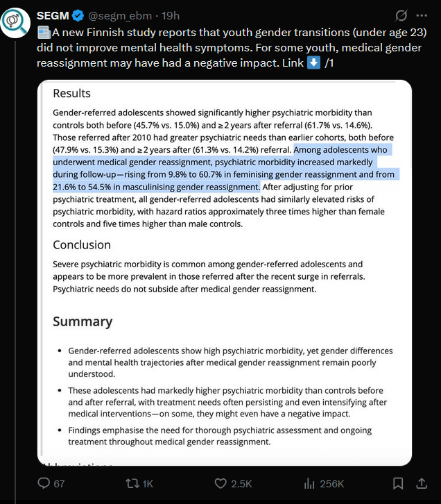 New scientific research optics nuke dropped?https://onlinelibrary.wiley.com/doi/10.1111/apa.70533>Among adolescents who underwent medical gender reassignment, psychiatric morbidity increased markedly during follow-up—rising from 9.8% to 60.7% in feminising gender reassignment and from 21.6%Of course this doesn't directly control the mental health, it could be that trannies just avoid getting to a psych before getting HRT because of stigma and stuff but I don't think conservatives are going to read this like that.