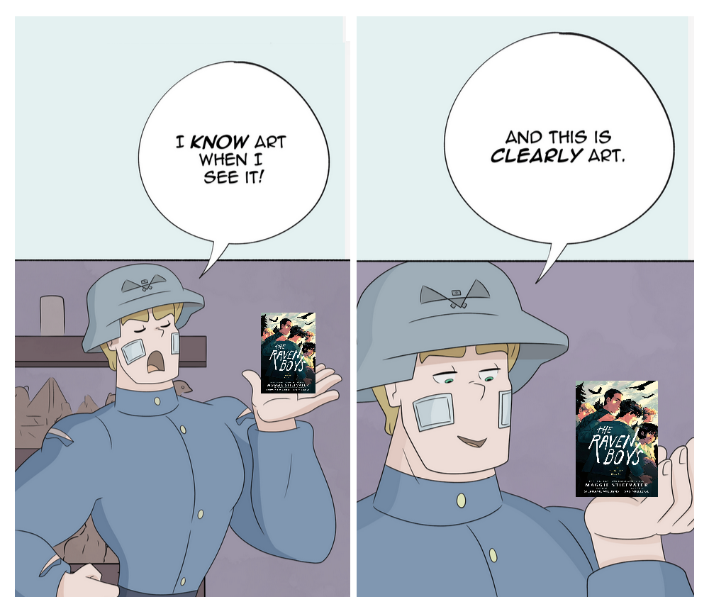 The happening continues, very slowly.>the discreet little magician>the sunnies>the keys>still drawing ronan like a doughboy for some reasonMan, I can't wait for people to get advance copies and point out more scenes that were removed or completely changed because they're too dark or too narrator-y or too gay in this book that is effectively a long coming out story.