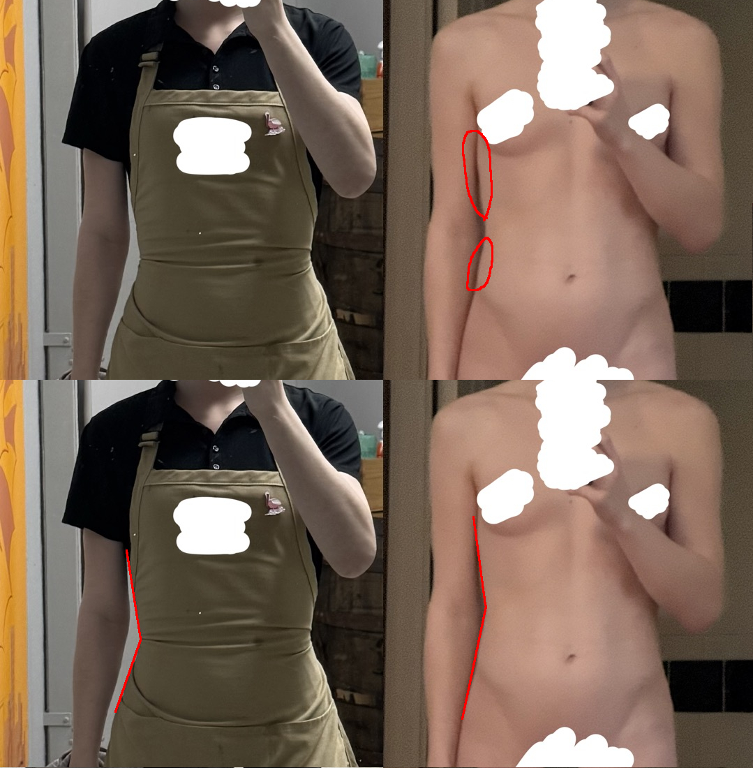 >>41502245as your eyes follow the contour of your body, these parts throw it off a bit - the clothes compress the tissue around it making it appear more angular