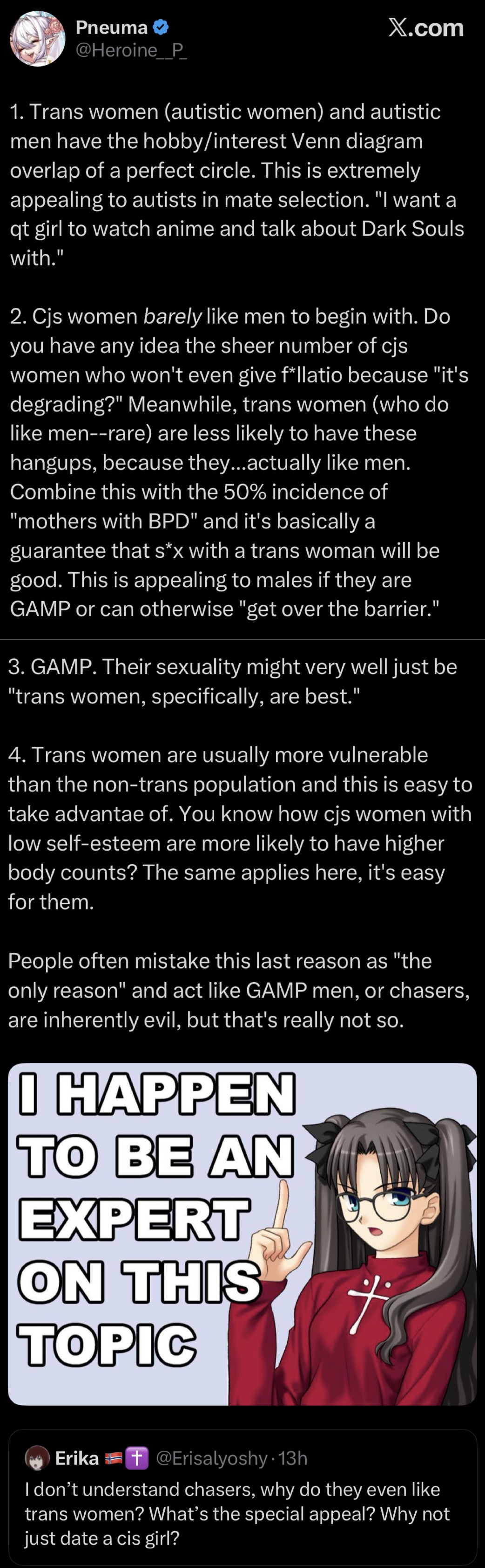 >>43160600How are they incels if they have loving trans gfs?>>43160601What is even offensive? Trans women obviously have lower standards and more nerdy interests. This isn't even transphobic. It's just obviously going to happen when you're isolated growing up and also basically zero men want trannies.
