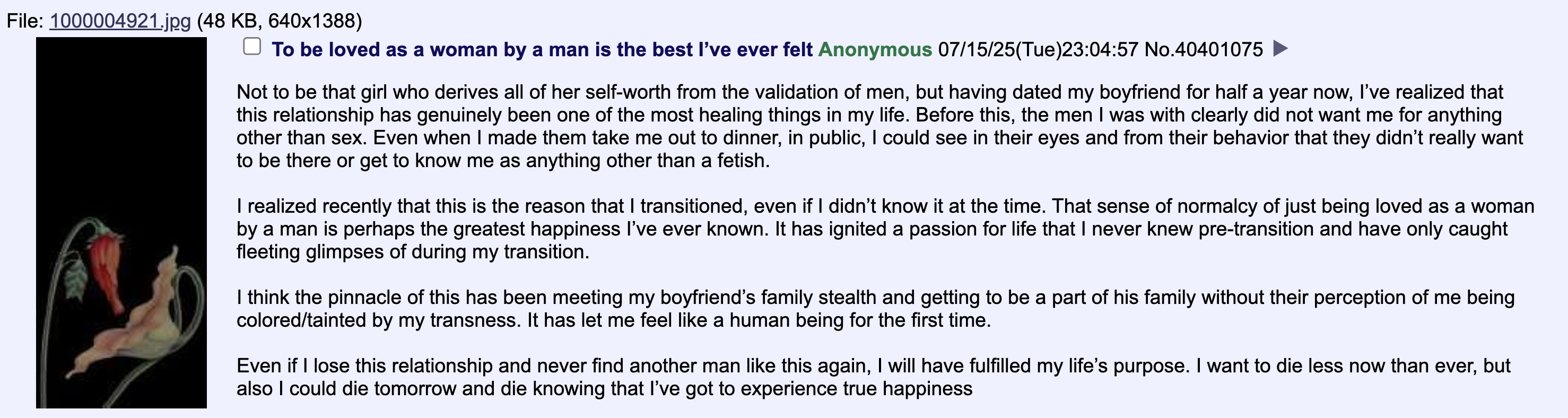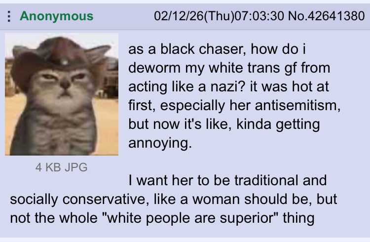 >>43160600How are they incels if they have loving trans gfs?>>43160601What is even offensive? Trans women obviously have lower standards and more nerdy interests. This isn't even transphobic. It's just obviously going to happen when you're isolated growing up and also basically zero men want trannies.