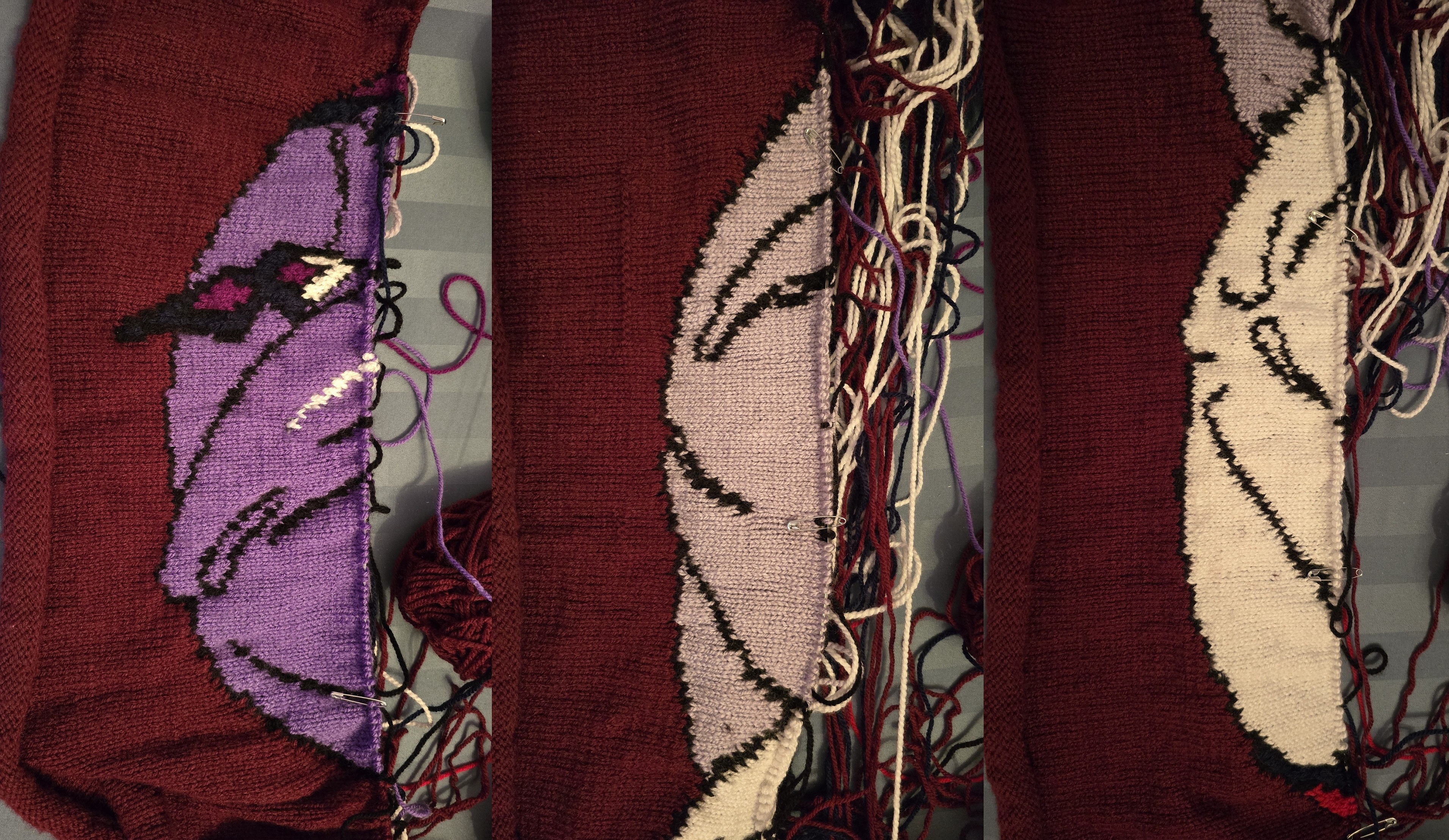 Yuri blanket knitting blog 4: Rows 61-80Happy Holidays /lesgen/! Okay so it's been a while since I made an update but I have a good reason for it. At the beginning of November I started making a present for a friend whose birthday is at the start of December (another knitted pillow with their favorite character on it) and I though I could get it done relatively fast but it ended up taking >1 month which also means I missed their birthday by a few days. Obviously I wasn't able to work on the yuri blanket while I was making their pillow but after finishing the pillow gift I was able to also get the next 20 blanket rows done so I can make the update but kind of forgot about it for a little bit :) Anyway, I'm visiting my parents for Xmas and new year's and normally I wouldn't be able to work on the blanket until after I go back home but since my laptop is on it's last legs and could die any moment, I didn't want to get stuck just staring at a wall for a few weeks so I decided to use the large luggage when I came to visit and brought all the yarn for the blanket with me. So now instead of being forced to take a break from making the yuri blanket, I should actually be able to work on it even more than usual due to boredom (there aren't many games that this laptop can handle).As for the blanket itself, despite how loose some of the stitches feel due to the large gaps between the colors, the actual image looks fairly nice! I could simply cut the yarn when I get to the really long gaps so that I don't waste so much yarn on the floaters in the back but having to tie multiple knots every row, sometimes even for just a single stitch sounds kinda annoying so I think I'll just keep doing the floater technique where I leave ~0.5 centimeters of yarn for every stitch that I jump over (so a gap of 100 stitches means leaving a 50 centimeter floater in the back).