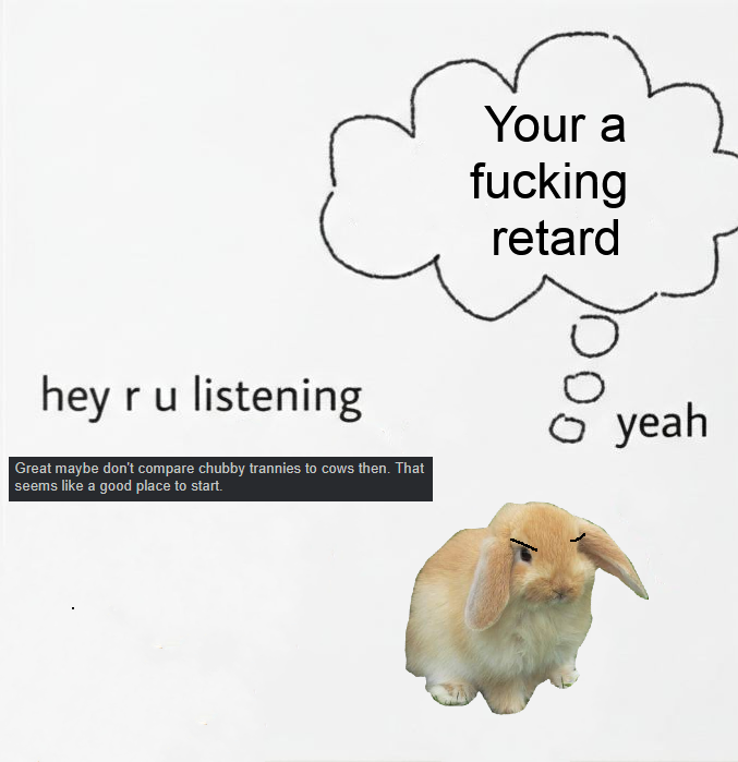 >>43096205First off, Cute cows exist jackass, look up shampooed cows. Using a cow as animal stand in doesn't imply weight, it implies shapeliness and fertility. IF I wanted to be offensive dick I would make it a bunny talking to a pig.Secondly, Fuck you there was no comparison being made or degradation. Lastly, the reaction image was made for chubby trans girl who goes by the name cow. Since I liked her photos so much, I made it as kind of a gift. So its a bunny fuzzy lop talking to a cute shampooed cow.