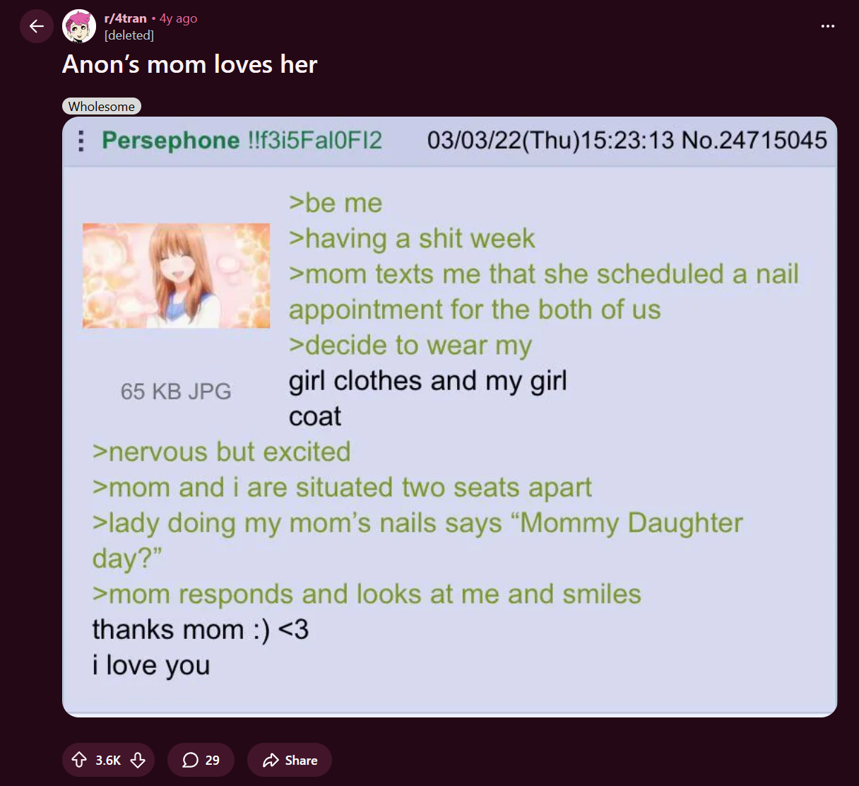My first time browsing it after finding out I'm trans and I come across this post. I read it all and she never explains why she posted it.Is this a girl thing I don't get?