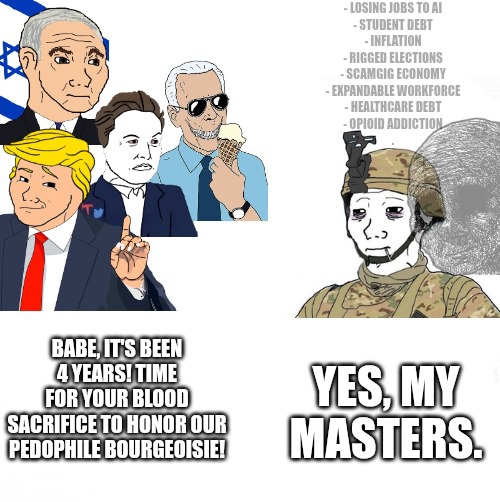 >>42893233Every time capitalist imperialism wants more oil they always draft the poor and broke ass youth to die overseas, most times in a country that never attacked US soil or US civilians. Why this time would be any different?