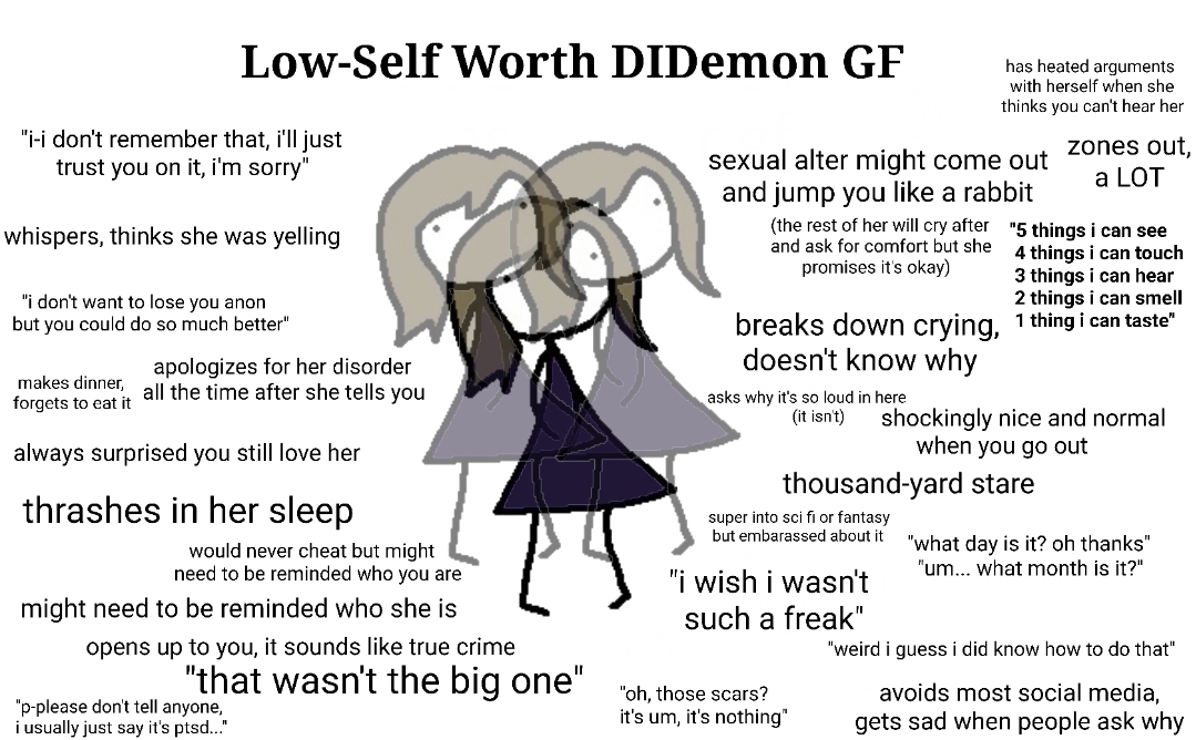 >>39402839we're all [name] but there are codenames for functional reasons, occasionally, purely inside my own head. to the external world i am always one unified person (who has mood swings and inconsistent amnesia). and inside there's usually no need for nicknaming because parts of me conversing is not quite the same pace or format as a real conversation