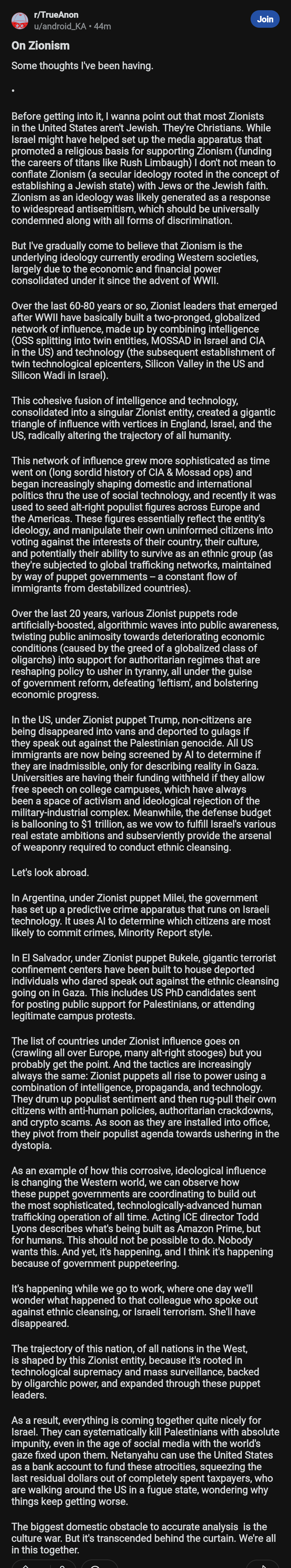 You just wanted an excuse to complain about da joos while tenuously connecting it to trans issues, in order to deliberately conflate nazi-like ideas about zionism with leftism. Your main goal with your propaganda ITT is to create as much confusion as possible while instilling a vague sense of menace on the part of trans people, all the while you push thinly veiled nazi sympathies.