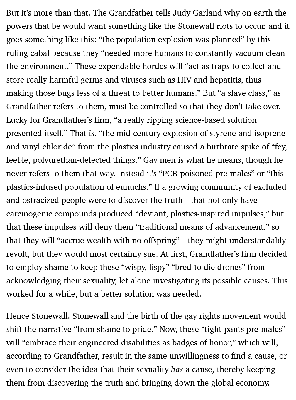 >Chuck Palahniuklmao>That is, “the mid-century explosion of styrene and isoprene and vinyl chloride” from the plastics industry caused a birthrate spike of “fey, feeble, polyurethan-defected things.” >Gay men is what he means, though he never refers to them that way. Instead it's “PCB-poisoned pre-males” or “this plastics-infused population of eunuchs.” https://www.esquire.com/entertainment/books/a44891150/chuck-palahniuk-fight-club-not-forever-but-for-now/