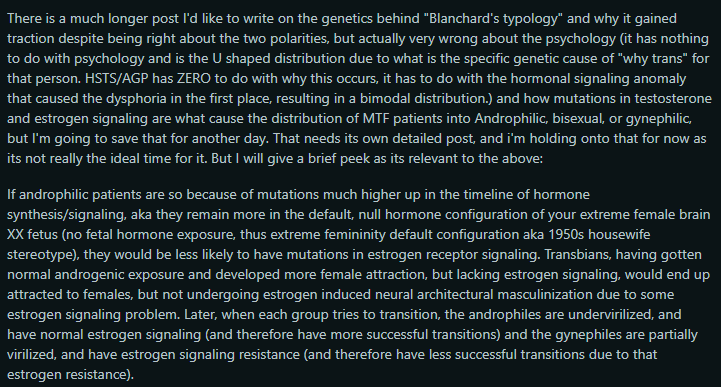 >>41313699Why do you think I agree with Dr. Powers here?I think he's reaching and way overgeneralizing and handwaving away counter-examples.I respect his care for the trans community and I respect he will chase answers to the end of the Earth, but I also think he's kind of crazy and that this theory is his current hyperfixation.