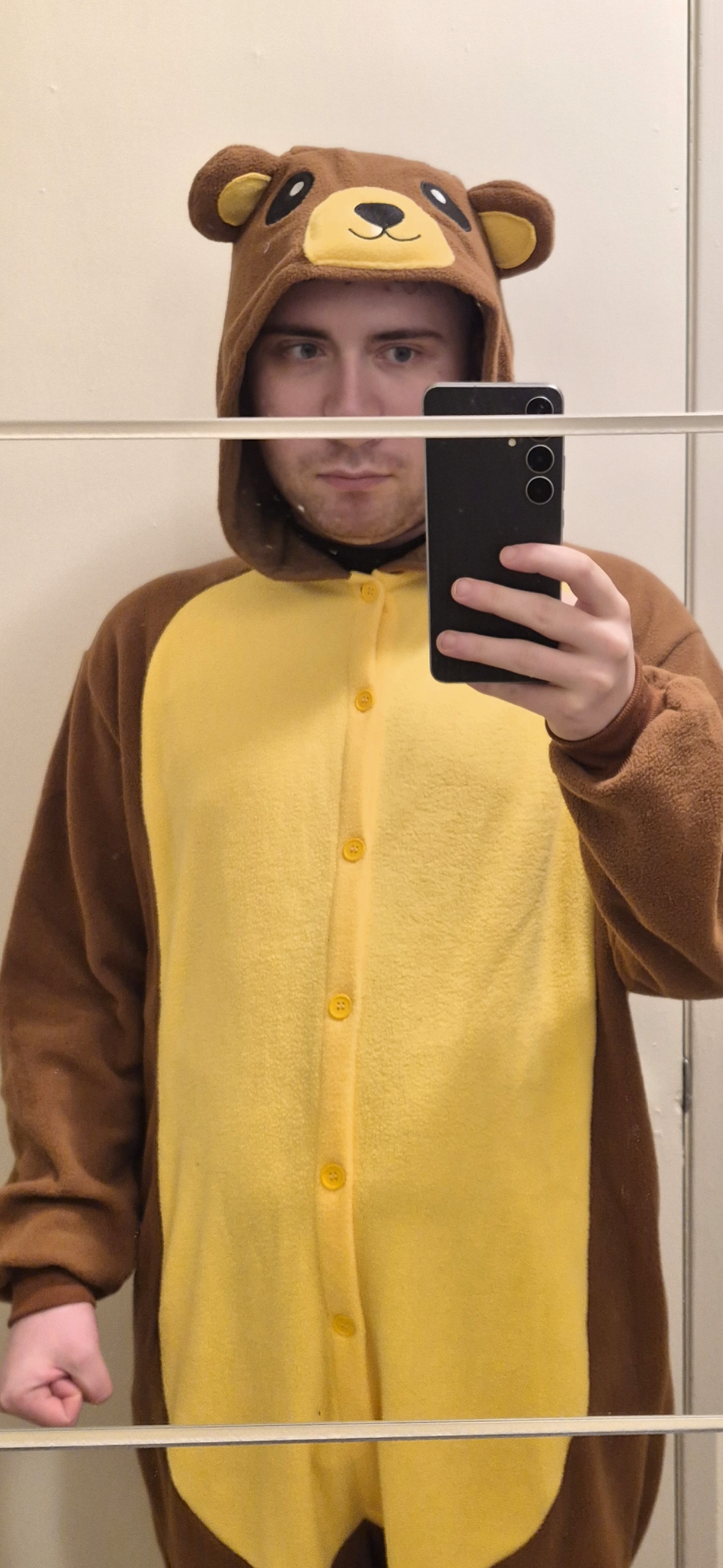 Im laying in bed in my bear costume with my weighted blanket and my plushies to help me with my schizophrenia