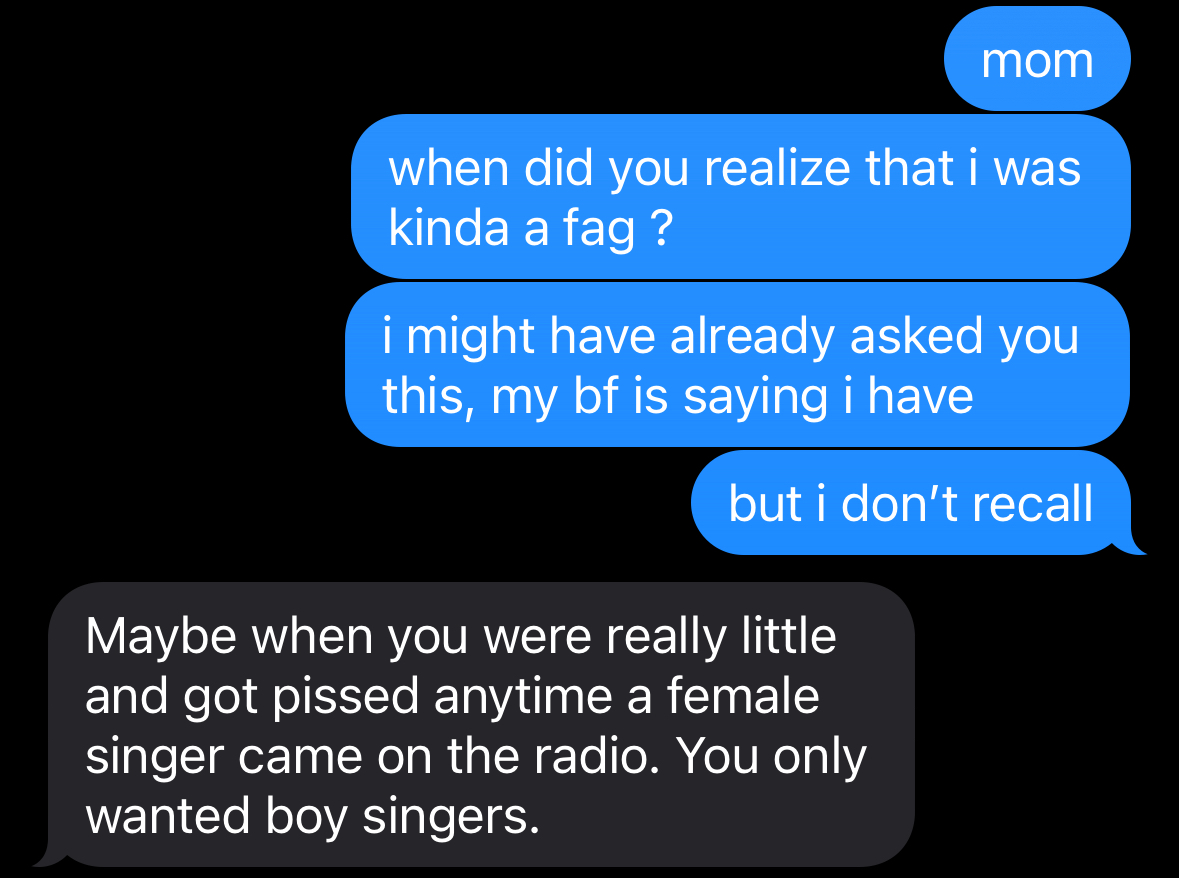 >>41387241feeling really guilty too because i asked my definitely repressing bisexual friend how he was doing with that and he got super uncomfortable and just told me he hasn't thought about it in years (he is clearly still very bisexual and just represses it by living in the midwest and going on constant hinge dates with mid women)