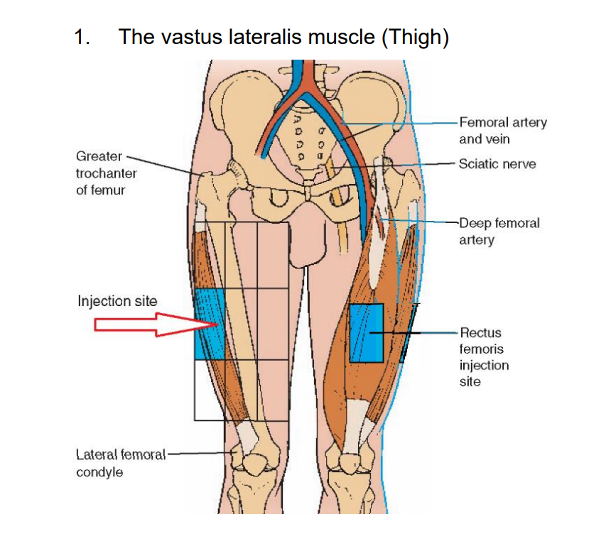 >>41411270Bleeding is usually an injection spot and technique issue. Here's an injection tutorial video if you want to give IM another shot, this is the one I follow and I haven't had any issues with it. https://support.getplume.co/support/solutions/articles/72000544742-all-about-injectionsThey also have a SubQ one if you want to stick with that instead, though I'm going to give a bit more advice on IM injections since I have some experience with them. A little bit of bleeding is normal for IM, if too much came out you probably didn't do in in the optimal spot (vastus lateralis//outer thigh, middle third vertically, see picrel) but even if you do it right you might get unlucky and nick a blood vessel, but it's fine. If you follow the guide, the only concern with blood coming out is your medication coming out with it, which the z-track method helps prevent Even then, if the bleeding or any potential pain bothers you I'd reccommend using the thinnest needle you can, which is going to be dependent on the viscosity of the ester you use. MCT oil has a very low one, so you can get away with drawing and injecting with 25g or 27g needles, others like Castor oil are thicker, so you might need lower caliber needles for them, though I wouldn't go any lower than 23g to prevent vial coring if yours uses a rubber stopperIf you do end up switching bak to IM, I'd stick to the thighs, I've read that glute shots aren't recommended anymore, if you pick the wrong spot you can actually fuck yourself up pretty bad bc of the sciatic nerve, same for delt shots but for a different nerve, thighs are by far the safest spot and if you follow the procedure you shouldn't face any major issues, just do thighs and switch legs for each injection to prevent scar tissue from forming and for the sake of proper absorption
