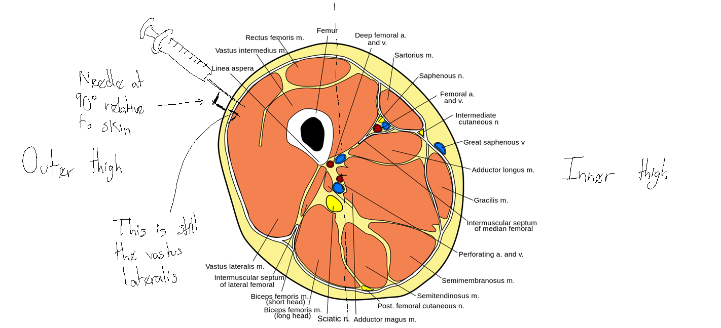 >>41413705The femoral artery doesn't run close to the vastus lateralis, it's deeper and closer in the inner thigh under the sartorius muscle (see the cross section I posted before, its the one labeled Femoral a. and v.). Outer thigh/Vastus lateralis is a super super safe injection site