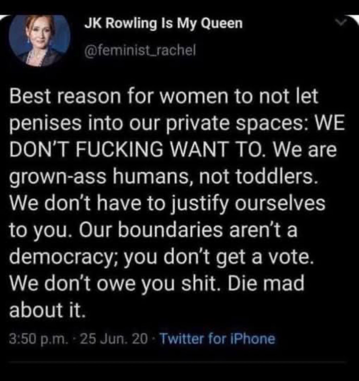 >>41450276>not let penises into our private spacesIs she finally coming out as a lesbian?